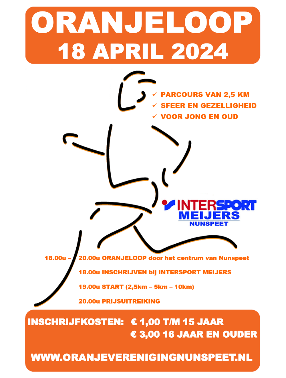 | 18.00u. – 20.00u. | ORANJELOOP door het centrum van Nunspeet in ronden van 2 ½ km. Met start en finish op het Marktplein van Nunspeet. Speaker; Jan de Bekker. |