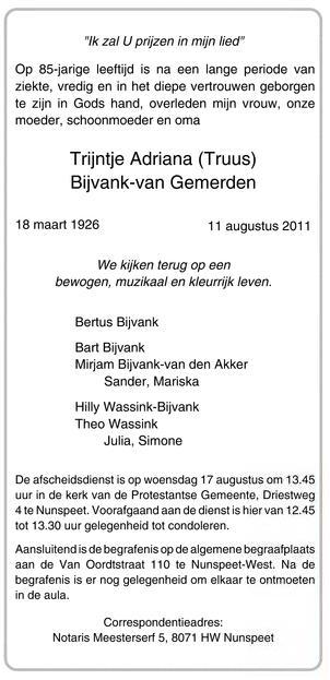 Het bestuur heeft het droevige bericht ontvangen van het overlijden van Mevrouw Trijntje Adriana...