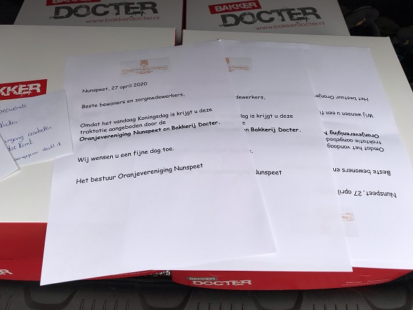 Onze ouderen in de verzorgingstehuizen ontvangen op KONINGSDAG altijd een traktatie. Deze traktatie wordt wisselend door de Nunspeetse bakkers aangeboden. Bakkerij Docter aan de Eperweg 3 verzorgde dit jaar de traktatie.
